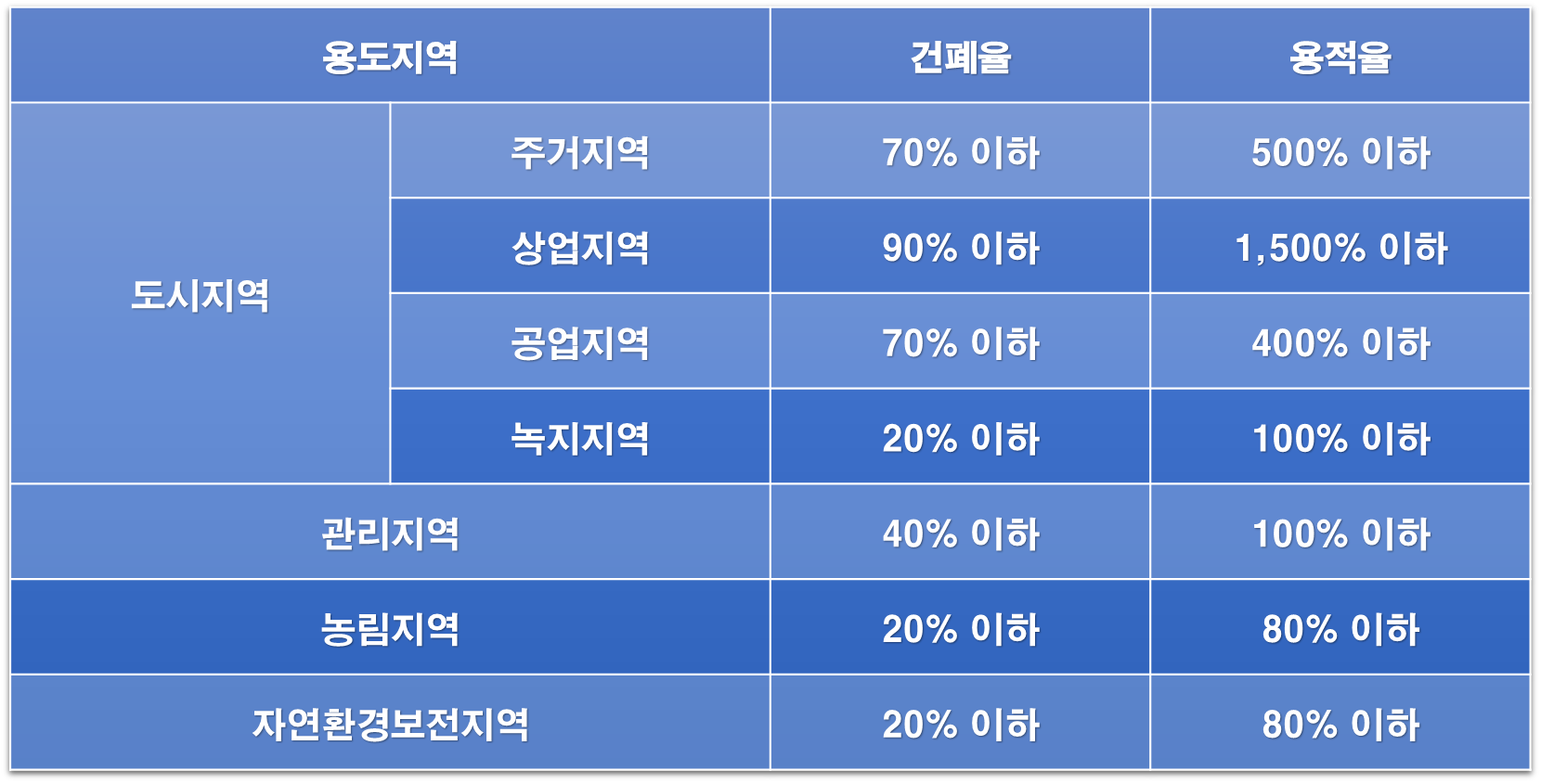 * 위의 기준은 용도지역별 건폐율, 용적율 최대한도임