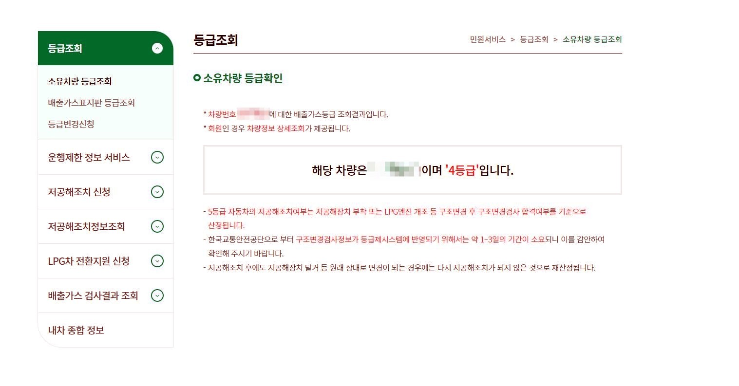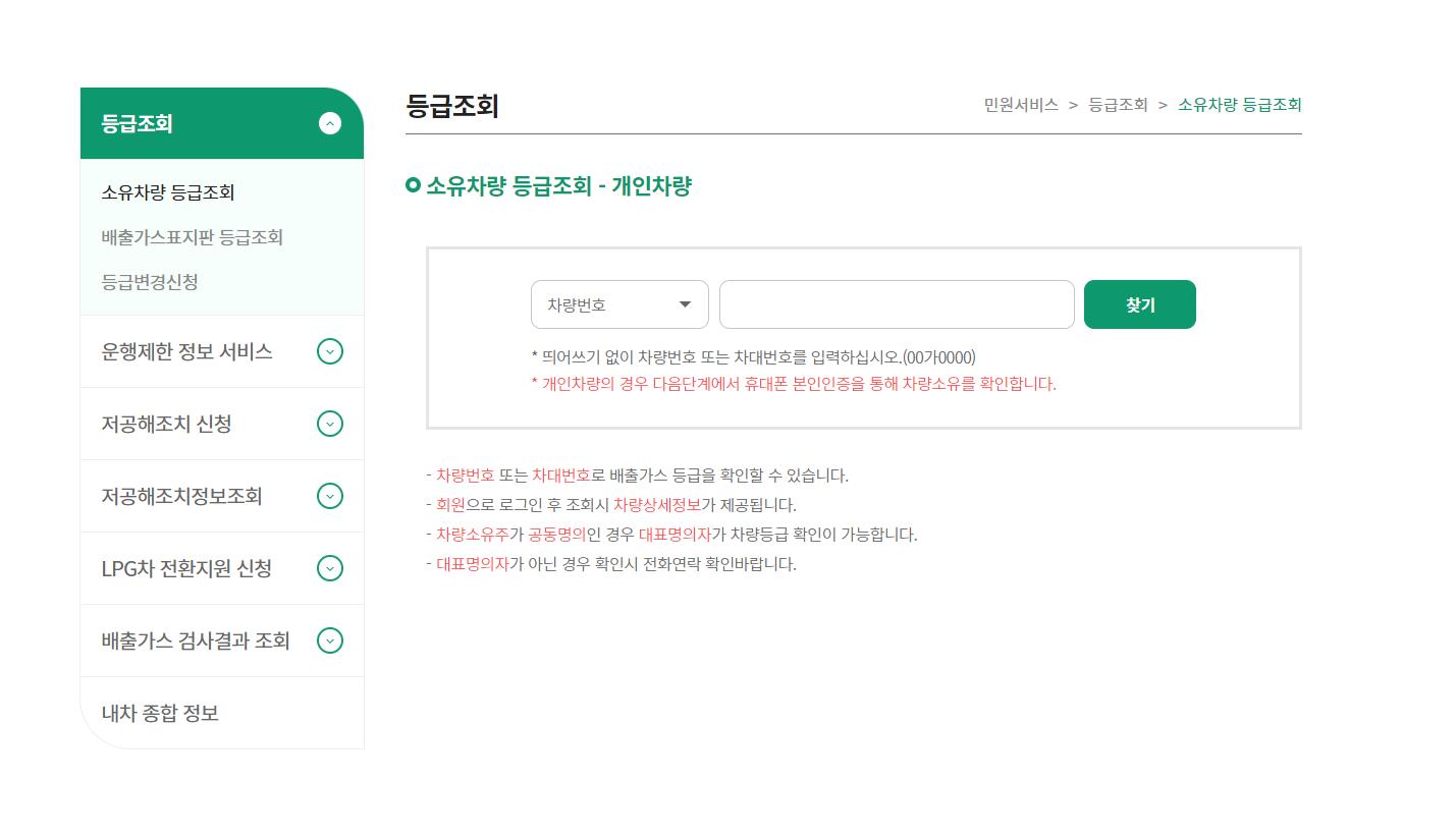 배출가스의 등급확인은 환경부 매출가스 등급 조회 사이트에서 조회가 가능하며