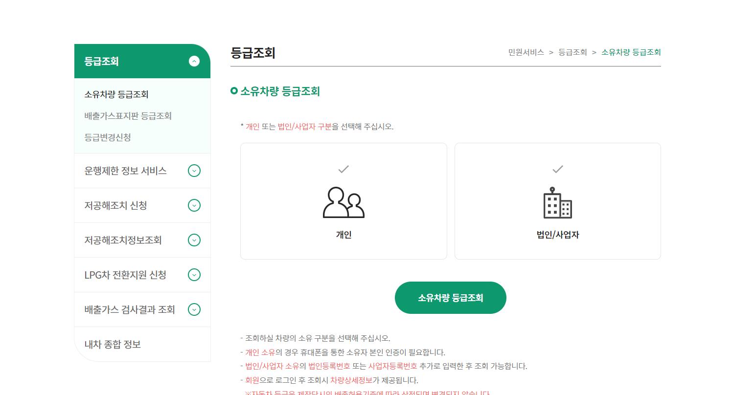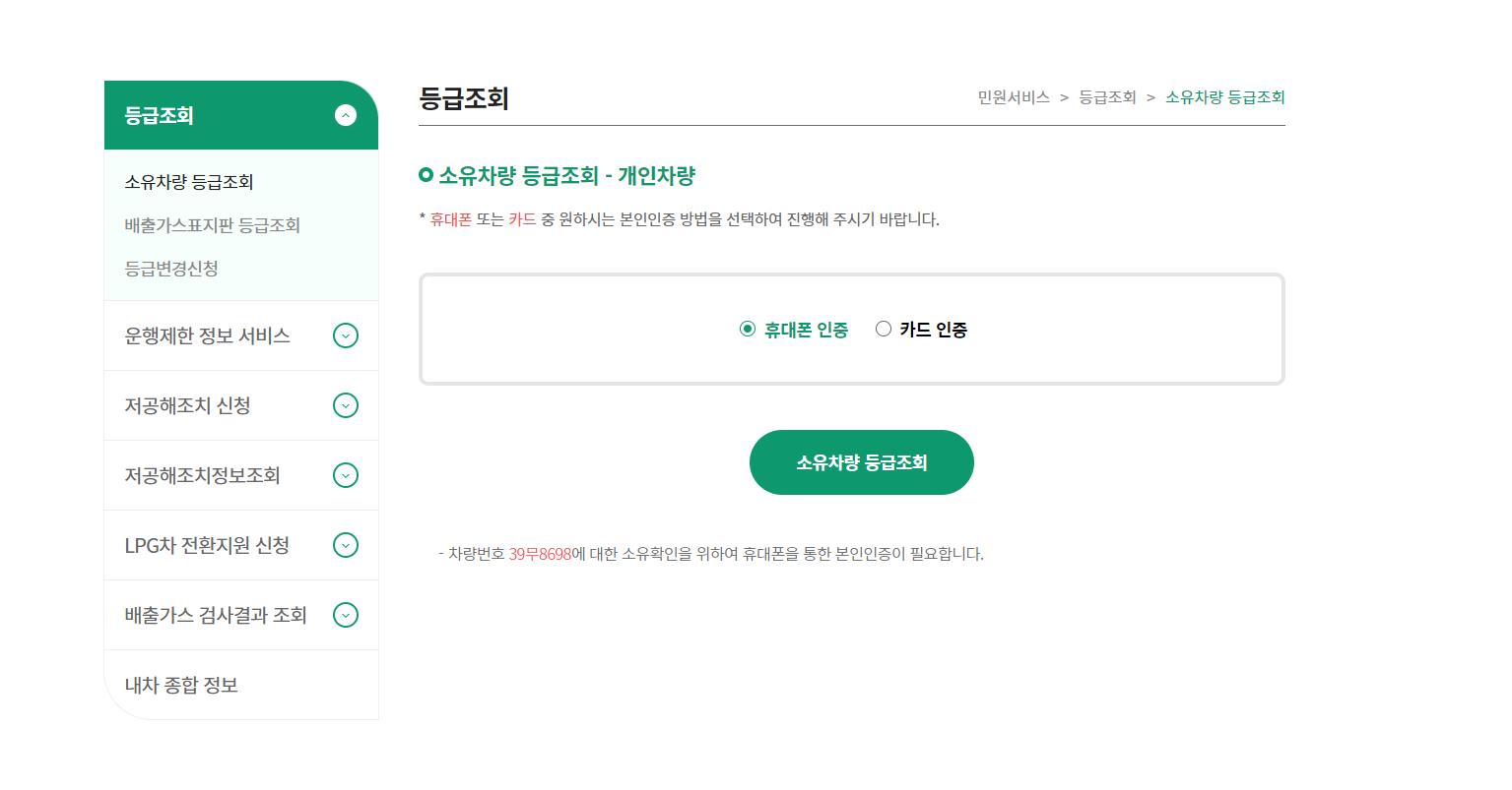 홈페이지 접속 -> 등급 조회 -> 개인/법인 선택 -> 차량 번호 입력 -> 휴대폰 or 카드 인증 -> 등급 확인