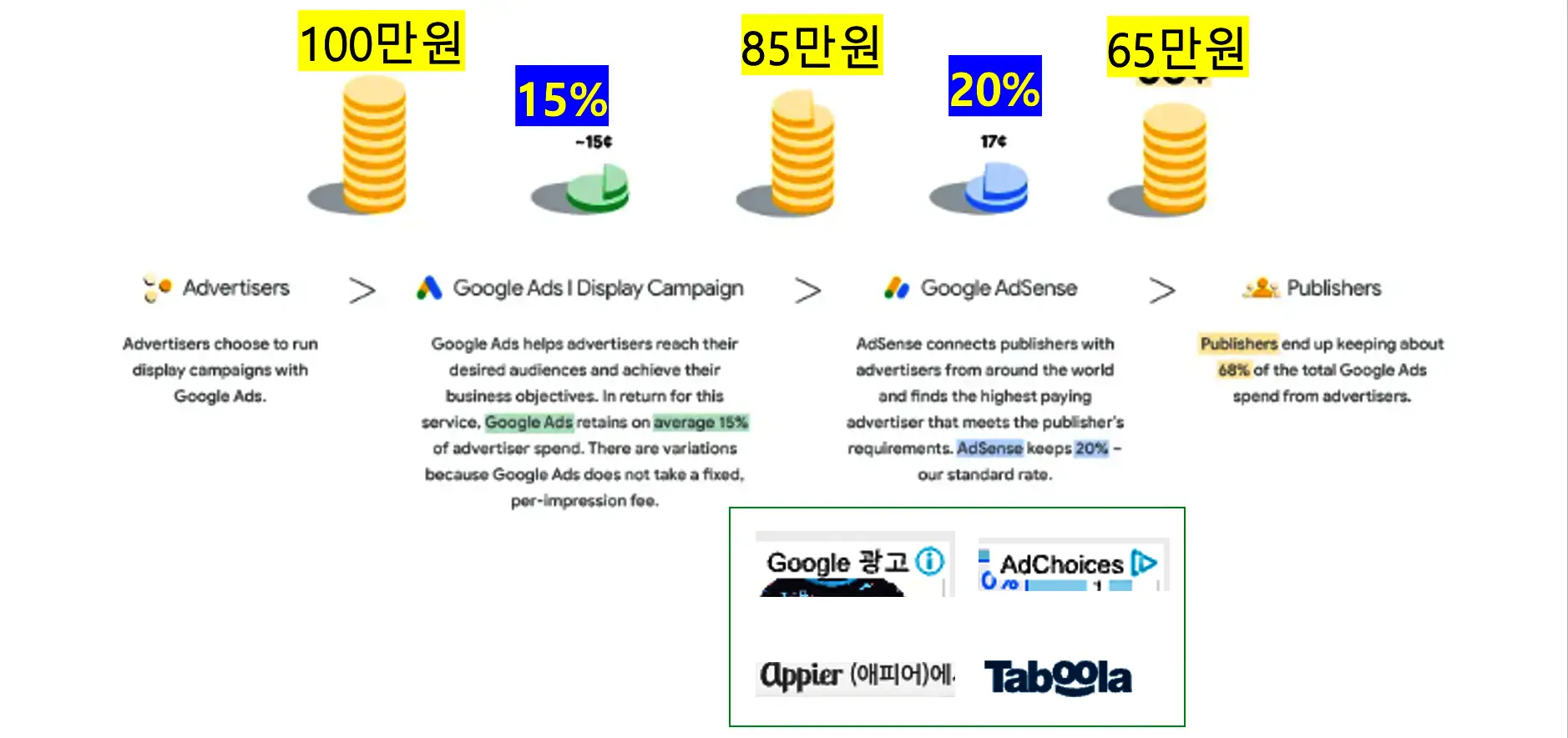 Goole Ads를 통해 AdSense에서 광고를 구매할 경우, Google Ads는 광고 지출의 평균 15%를 유지한다. 출판사는 전반적으로 수익의 약 68%를 계속 유지한다. 제삼자 플랫폼을 사용하는 광고주의 경우, 출판사는 제삼자 플랫폼이 수수료를 취한 후 수익의 80%를 유지한다.