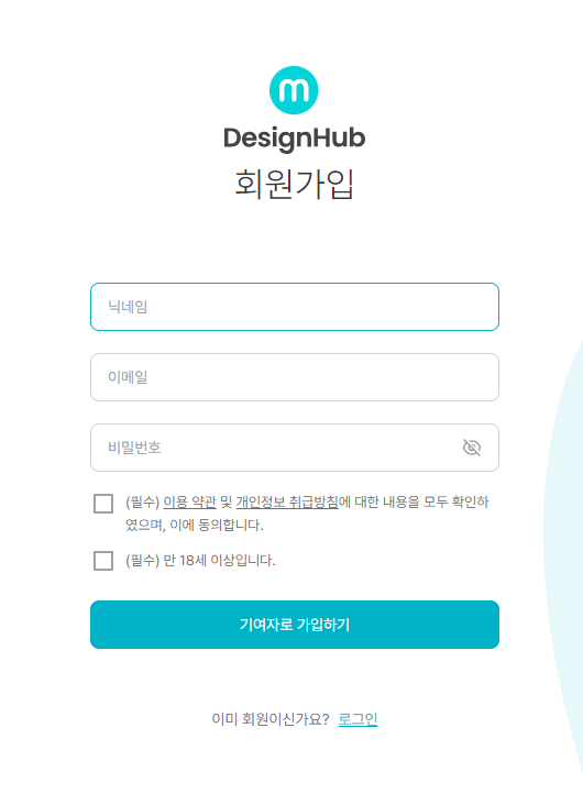 회원가입 양식도 간단해서 '닉네임', '아이디', '비밀번호'만 입력해주면 바로 회원가입이 됩니다.