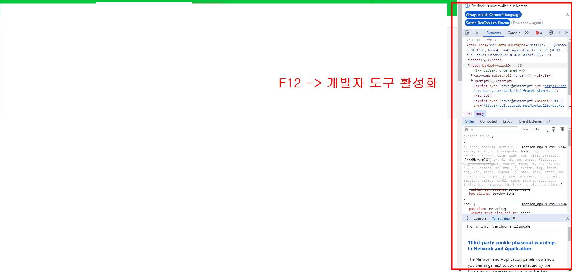 - 브라우저에서 펌방지에 되어 있는 웹페이지 상에서 키보드 F12 -> 개발자 도구 기능 활성화