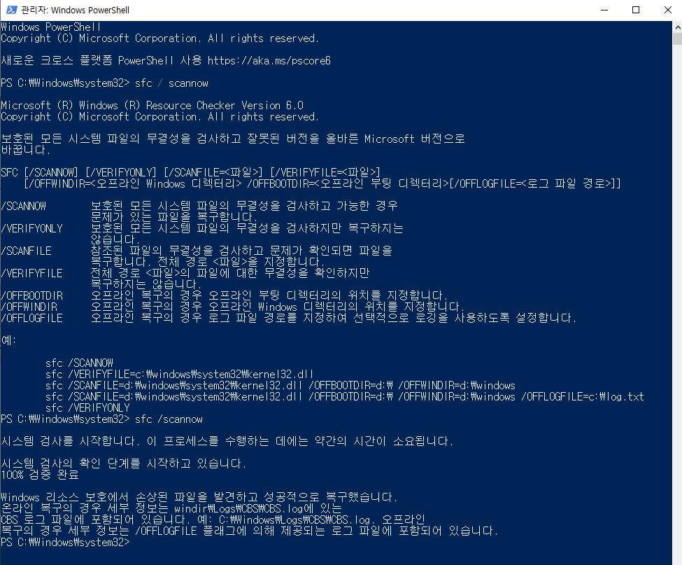 - 작업 관리자 → "파일" → "새 작업 수행" → powershell (관리자 권한).
